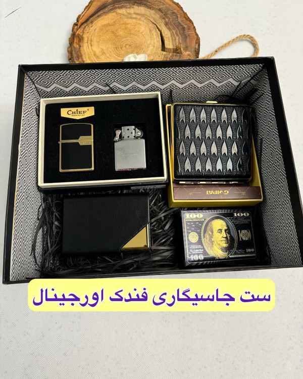 ست فندک اورجینال چیف دومغزی ( هم مغزی گازی و هم بنزینی داره) جاسیگاری گوپای بسیار با کیفیت پاسور دلار مشکی و همچنین یه جاکارتی خوش رنگ داخل ست مشاهده میکنید ، بعلاوه یه بنزین ۶۰ میل هم هد…..یه از طرف ما روی ست هست