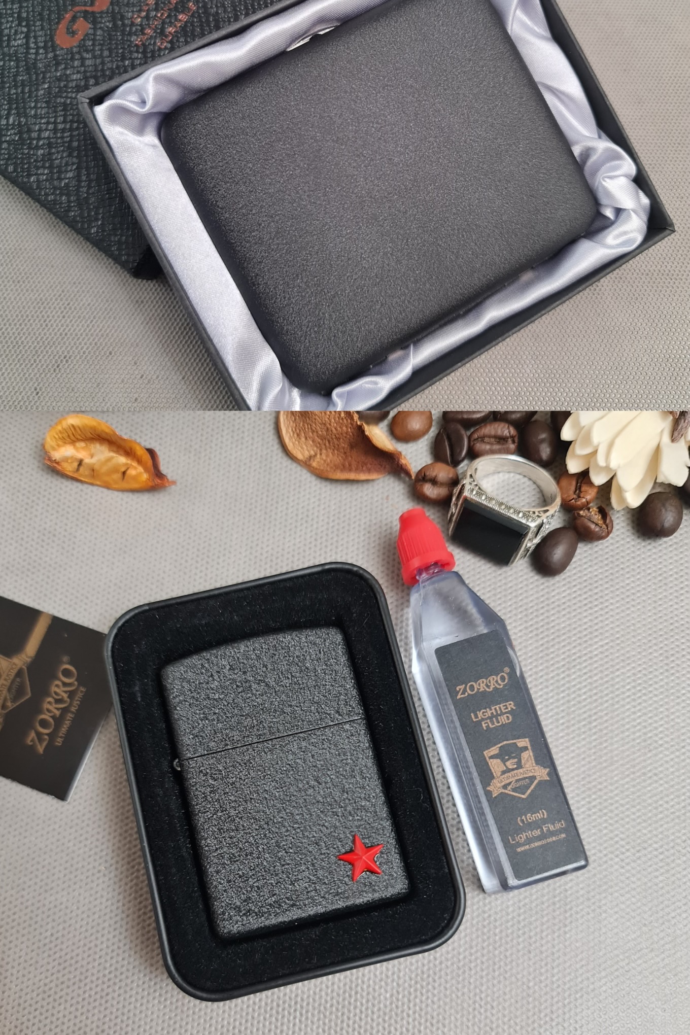 ست جاسیگاری فندک اورجینال فندک بنزینی از برند معتبر زورو همراه بنزین و جاسیگاری گوپای بسیار با کیفیت با ظرفیت ۱۸ نخ