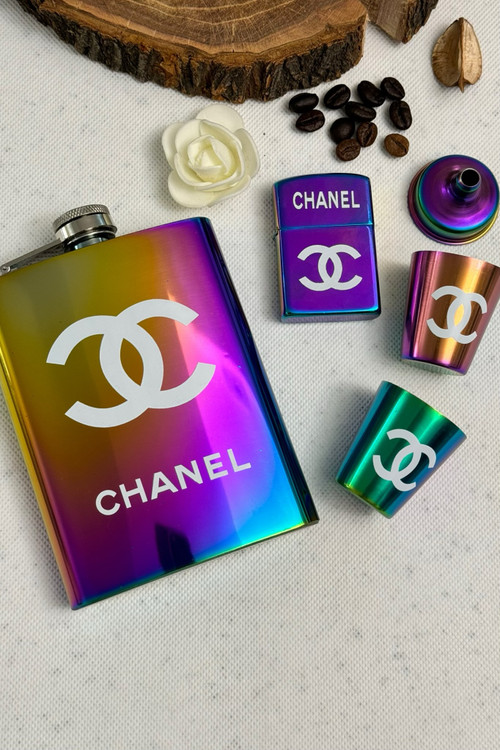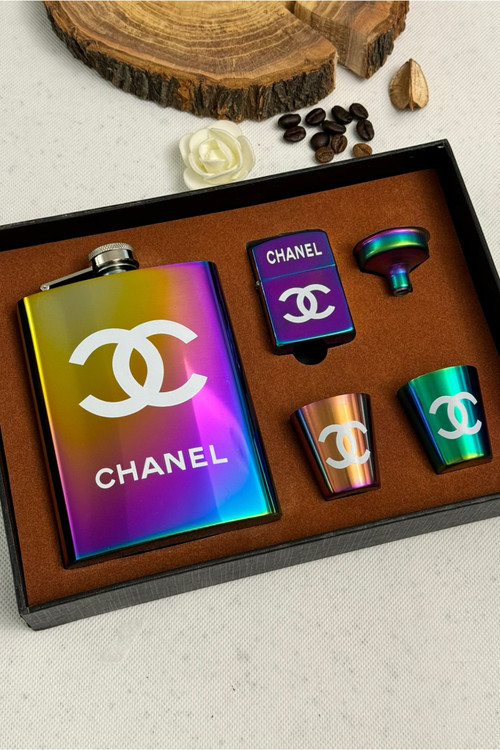 ست قمقمه جیبی چنل از برند اورجینال گیفت orginal gift همراه فندک بنزینی و دوعدد شات و یک قیف جهت سهولت در پر کردن بطری