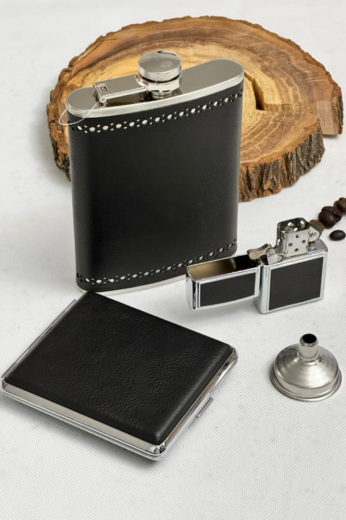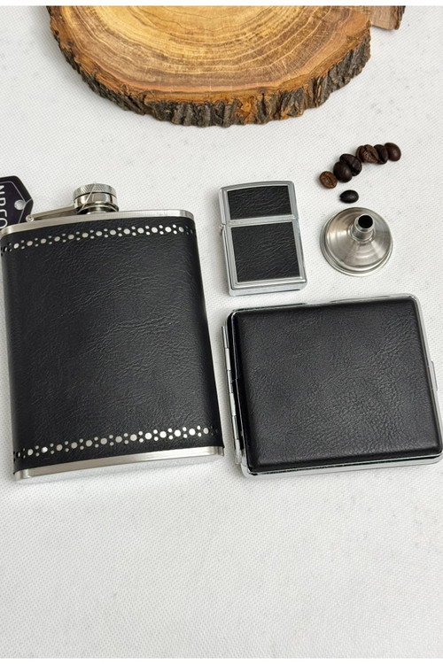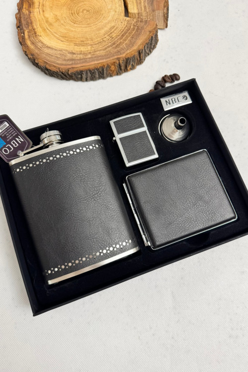 خرید ست بطری جیبی چرم همراه جاسیگاری و فندک بنزینی از برند معتبر nbco