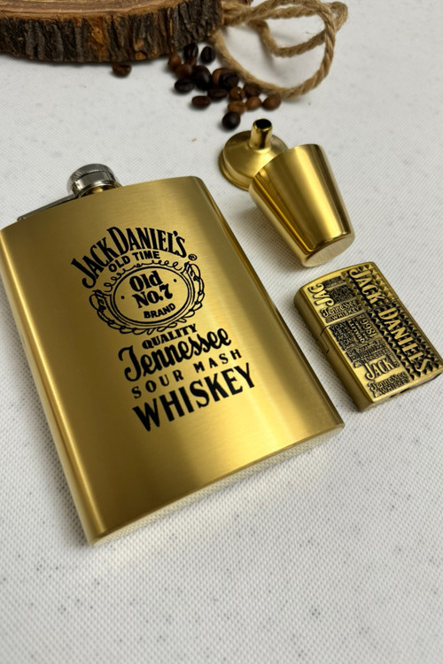 ست هیپفلاسک گلد با ظرفیت ۲۴۰ سیسی و فندک گازی و شات و قیف