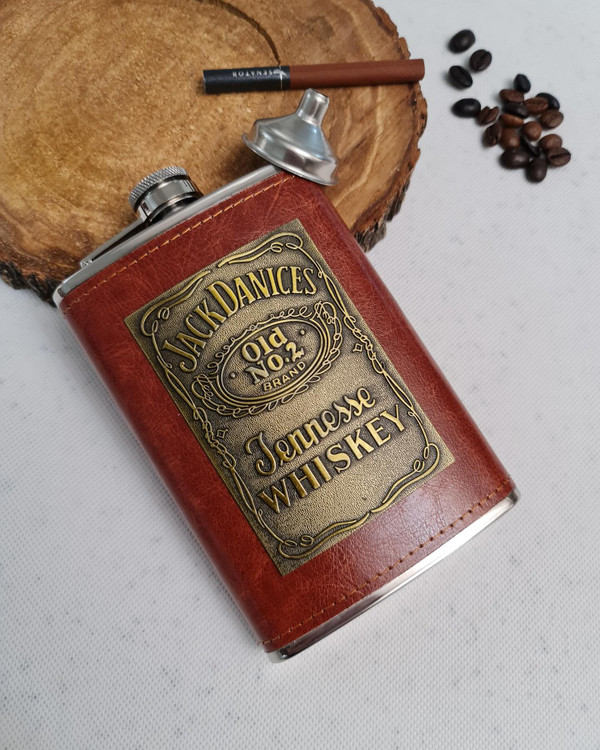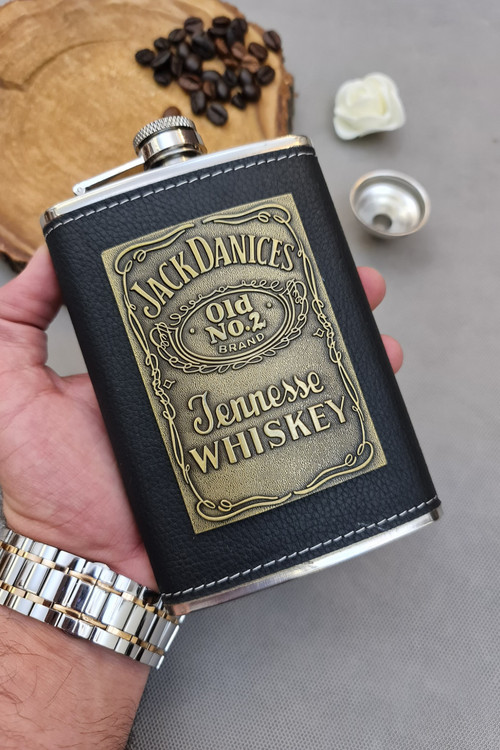 هیپفلاسک چرم جکدنیلز با ظرفیت ۲۴۰سیسی ، از برند معتبرOG همراه قیف جهت سهولت در پرکردن بطری تقدیمشما